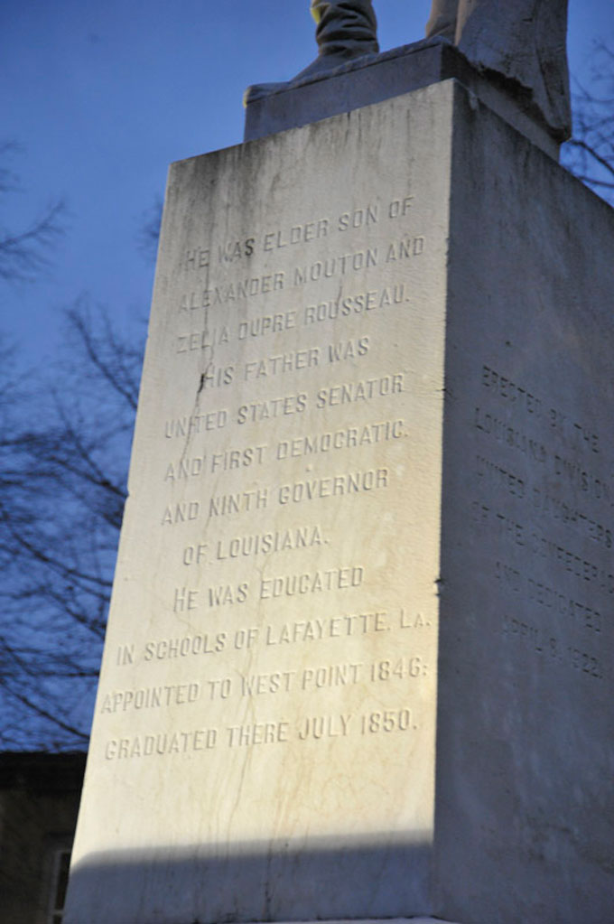 We don’t know if he was noble, outside of his station as a member of a patrician planter family. But Alfred Mouton was most certainly brave. He resigned his West Point commission at the outbreak of the Civil War, led the 18th Louisiana Infantry as a colonel into battle at Shiloh where he was wounded, convalesced in New Orleans, was promoted to brigadier general and died in battle at Mansfield in 1864, picked off by a Union sniper. He was 35 years old. Ten years after his death, his remains were moved from Mansfield in North Louisiana to St. John Cemetery behind the cathedral in Lafayette. A Sons of Confederate Veterans chapter in Opelousas is named for him. It has a monument to Alfred, too.
