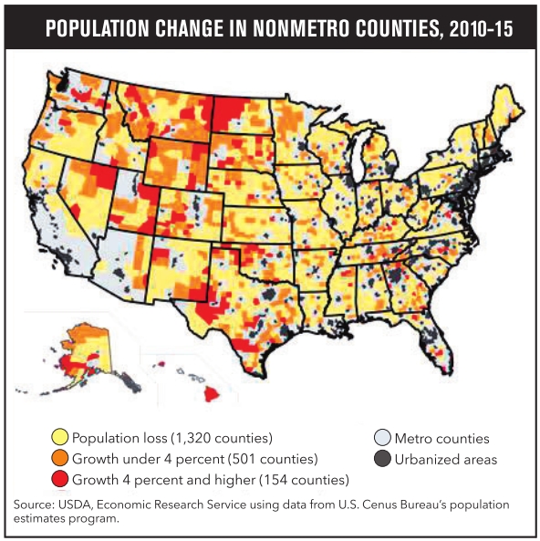 What makes Republicans including Trump so popular in rural communities? Explanations run along two axes: economic and cultural. Focusing on the economic, rural areas all across America are losing people and with them development, jobs and opportunity. The USDA’s 2016 “Rural America at a Glance” reports that the “number of people living in rural counties stood at just over 46 million in 2014,” amounting to 15 percent of U.S. residents, an all-time low. Yet, this population continues to decline each year by about 30,000 people, in sharp contrast to urban populations that “continue to grow by more than 2 million per year.”