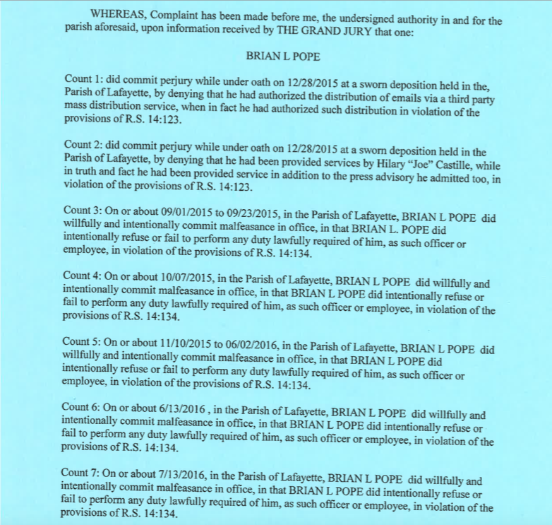 Lafayette City Marshal Brian Pope may not be the only person going down over his efforts to hide public records proving he colluded with Chad Leger’s campaign for sheriff last year, as the attorney Pope first hired to help him in the coverup was indicted by a Lafayette Parish grand jury Wednesday for perjury. The same grand jury, which slapped five felony counts on Pope in August, also tacked on two additional malfeasance in office charges against the city marshal in a superseding indictment Wednesday.