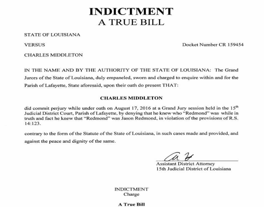 The single perjury charge against Middleton, who withdrew his representation of Pope earlier this year, is related to the duo’s involvement in the drafting of a November 2015 motion to have Sheriff Mark Garber’s divorce record unsealed at the Lafayette Parish Courthouse (see below). Middleton then invoiced the marshal’s office for the “Mr. Redmond” motion, and Pope paid the bill. Pope and Middleton, The IND has since learned from the court record, believed the sealed divorce file contained an incriminating and embarrassing video of Garber, who defeated Pope’s favored candidate for Lafayette Parish sheriff last year. The file contained no such video.
