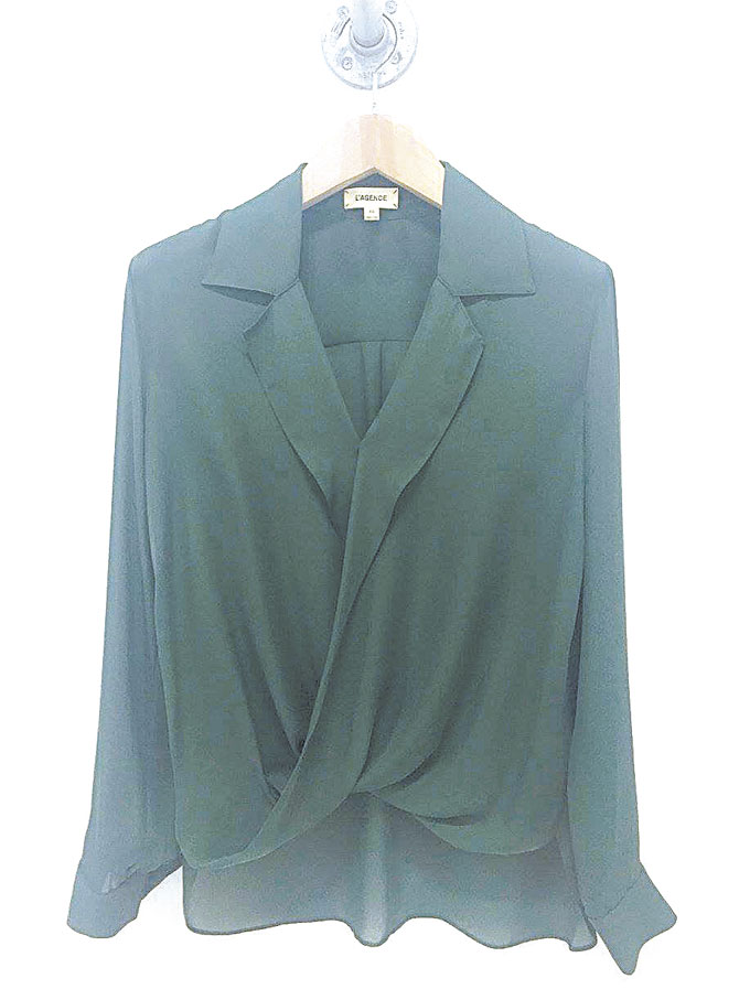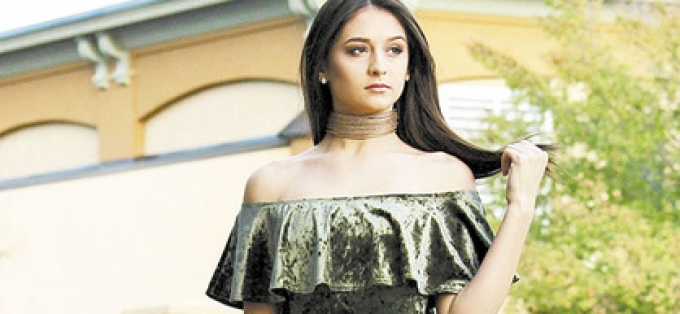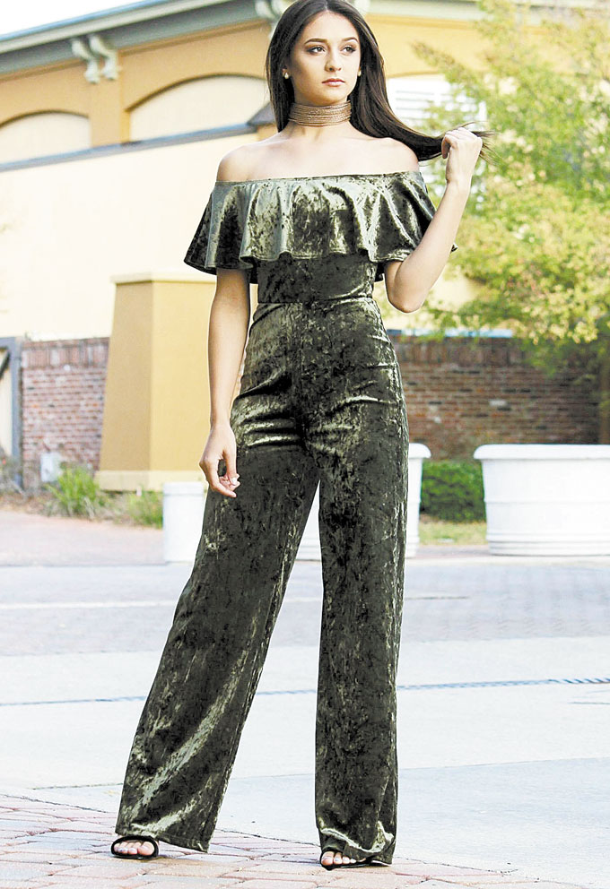 Two trends in one — off the shoulder and jumpsuit — are a muted green from HerringStone’s Two Sisters’ Boutique.