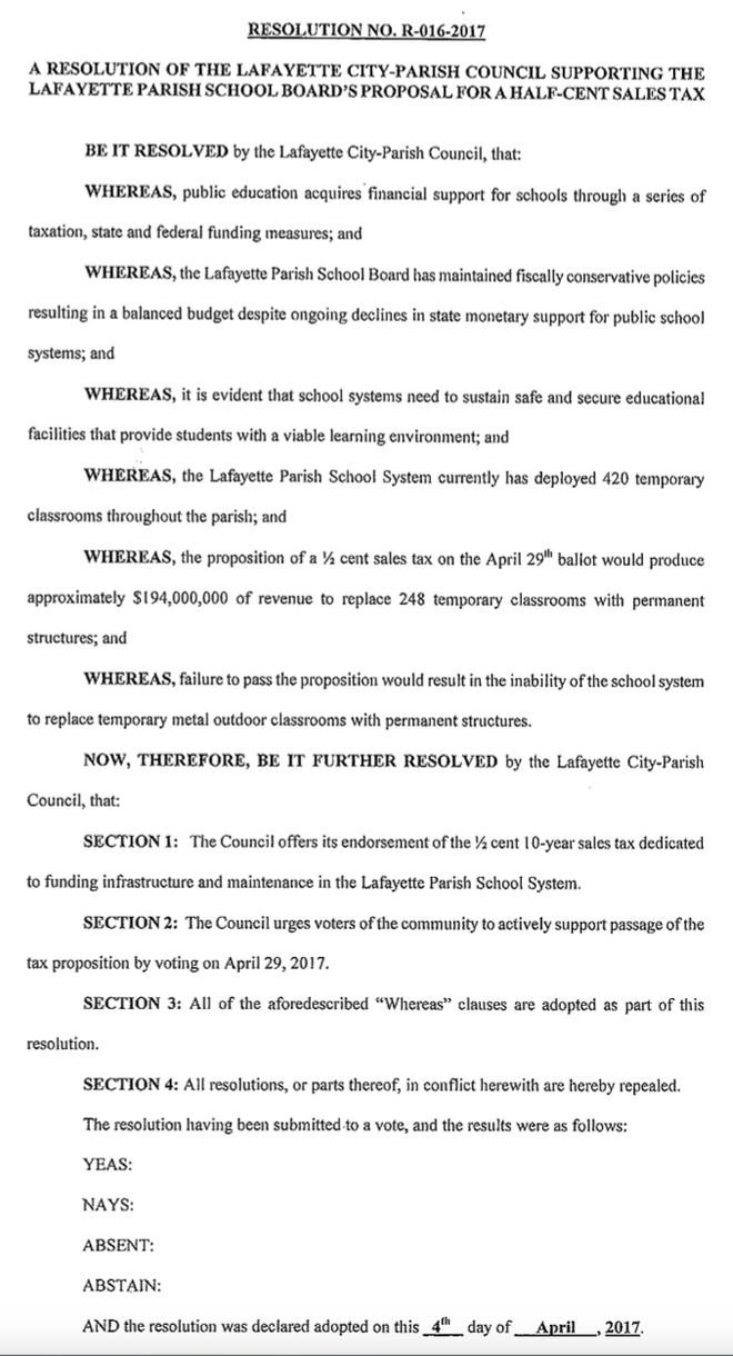 The City-Parish Council will vote Tuesday on a resolution in support of the Lafayette Parish School System’s proposed 10-year, .5-cent sales tax on the April 29 ballot. If approved the tax would generate about $194 million toward facility improvements — that includes getting students in the parish out of about 250 temporary classrooms and into permanent classrooms — and replace Prairie and Carencro Heights elementaries with new school facilities.