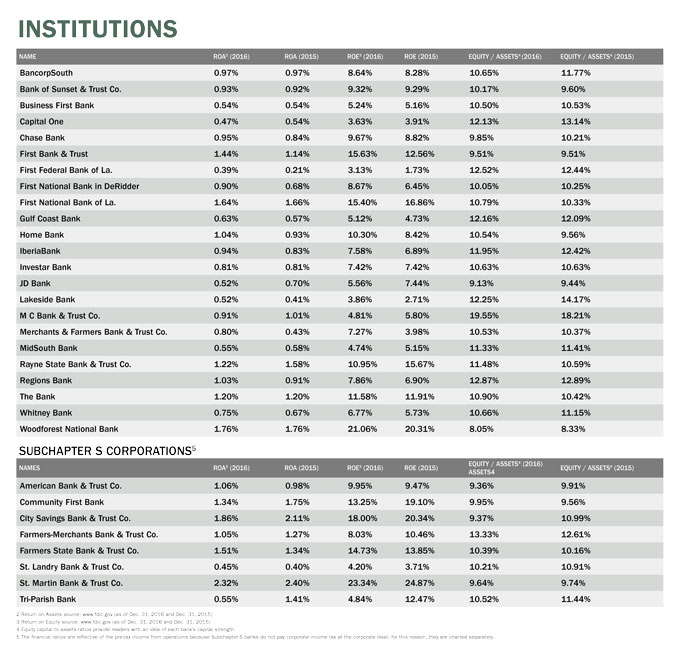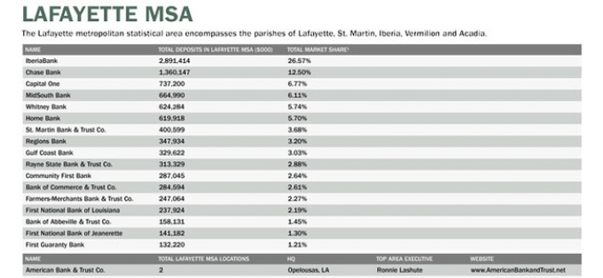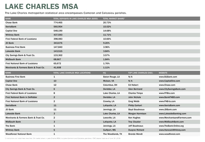 The following charts show 2016 market share percentages for banks operating in the Lafayette and Lake Charles metro areas; the total number of locations and top execs in those MSAs; and return on assets and return on equity for those financial institutions.