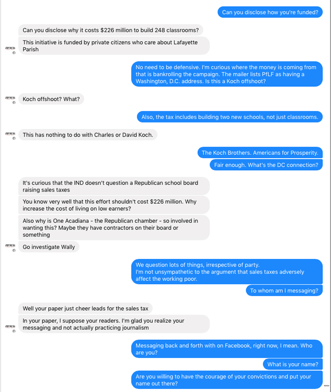 I reached out via direct message on Facebook to Citizens Against the School Tax and got very little. The person fielding my questions obviously knew who I am — he or she even knew my nickname — and about my employment, but wouldn’t provide any answers about where their funding comes from or who they are:
