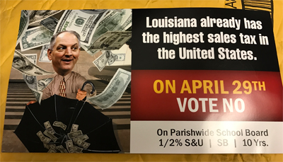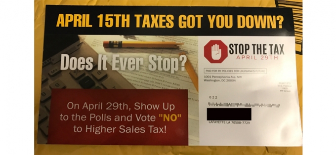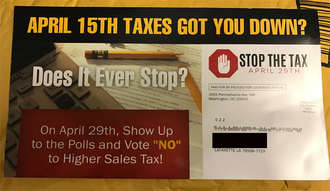 The misinformation is being disseminated on Facebook by a group calling itself Citizens Against the School Tax, part of shadowy effort to gin up an anti-tax furor that crested with the Tea Party several years ago, and it’s built on selective readings, misrepresentations and distortions. If you scan Citizens Against Tax Reform’s Facebook page, you’ll see graphics that are identical to images on a recent mailer that went to Lafayette residents. The mailer was produced by a group, presumably a political action committee, based in Washington, D.C., called Policies for Louisiana’s Future.