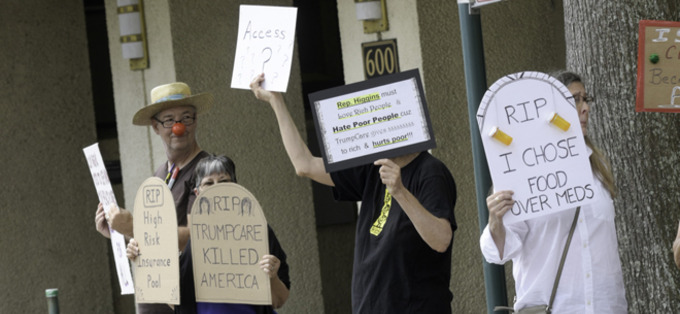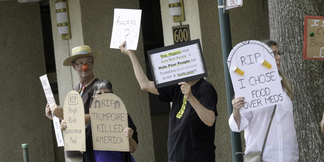 About 20 members of the progressive activist group Indivisible Acadiana, most of them funereally clad in black and carrying tombstones and other death paraphernalia, staged a “die-in” on Jefferson Street at the foot of Chase Tower Thursday to protest Congressman Clay Higgins’ vote to repeal the Affordable Care Act. Higgins’ Lafayette congressional office is on the eighth floor of the building.