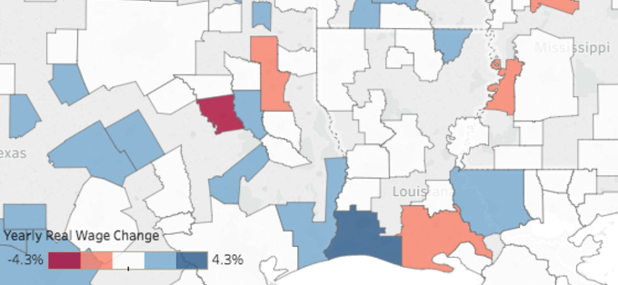 By contrast, the report shows that Lafayette wages have declined in that same time frame by 1.8 percent, due in large part to stagnation in the price of oil since a cataclysmic crash in 2014.