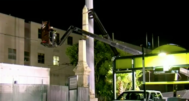 The Battle of Liberty Place monument in New Orleans is removed from public view in late April.