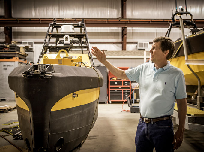 Chance says the experience gained at C&C gives ASV a particular advantage. “We have people that have been putting electronics in salt water for 20 years,” he Photo by Robin May says. “It’s always underestimated how easy it is for water to get in to connectors and mess stuff up. We have people that know how to operate in 12-foot seas and not do crazy things. We have people who know how to write software for autonomous systems dating back to the CajunBot. It takes all of those links in the chain to make it work.”
